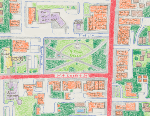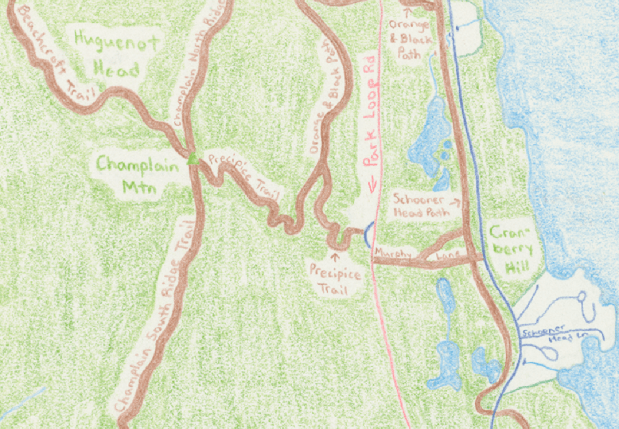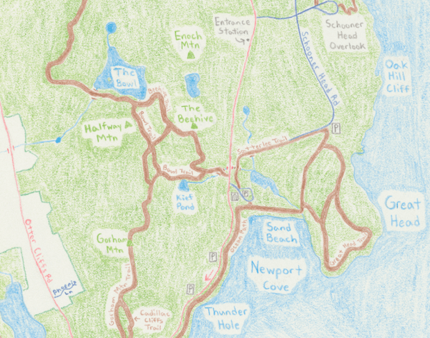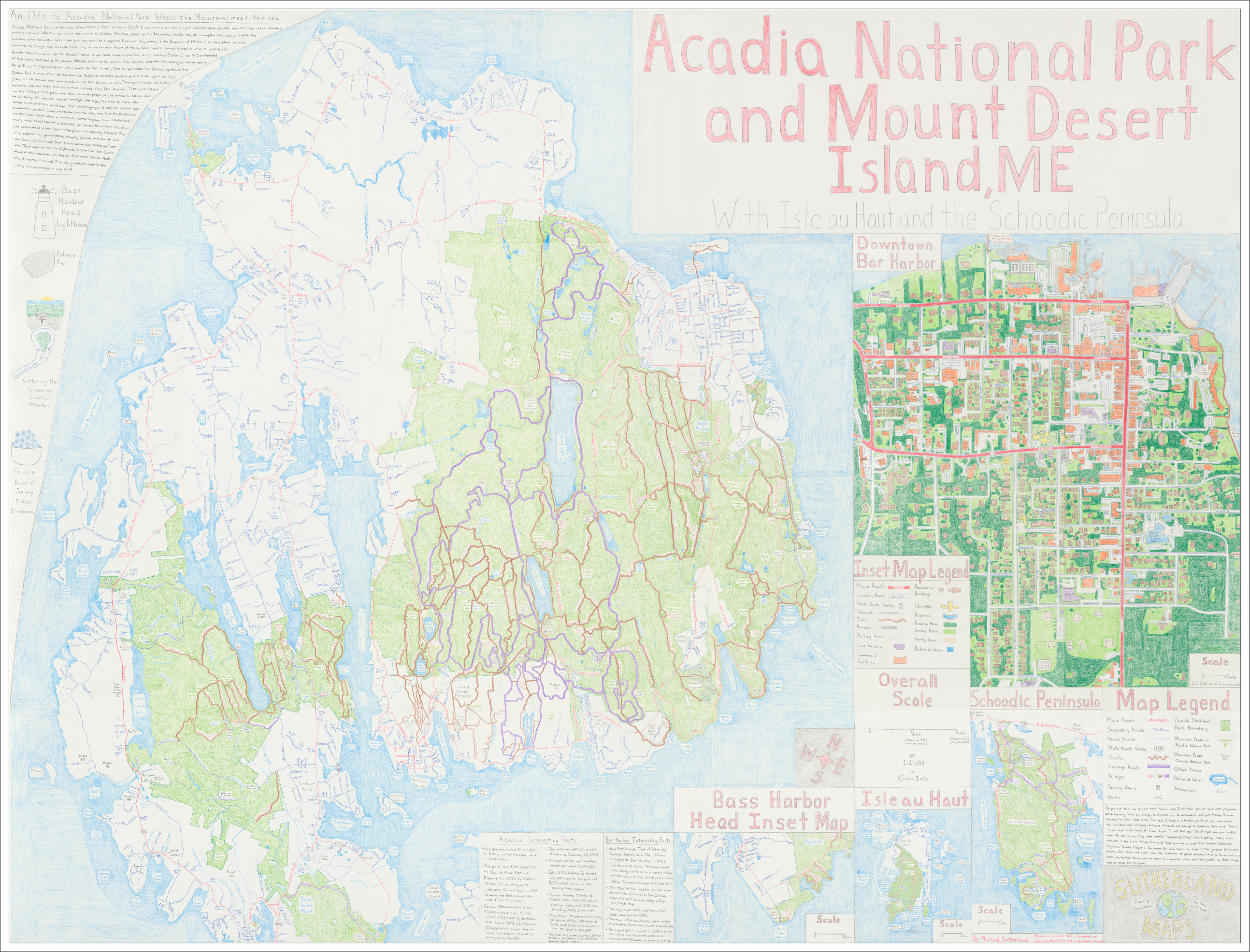 This is a map of Acadia National Park hand-drawn by myself. It encompasses all of Mount Desert Island, ME, highlighting in-particular Acadia’s trails and carriage roads. You’ll also see an inset map for Downtown Bar Harbor, highlighting the towns shops and residences. Currently it’s sold at the size of 27 by 36 in.