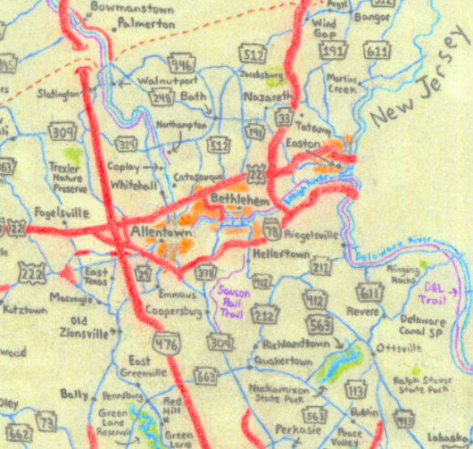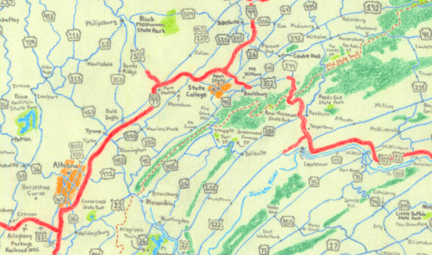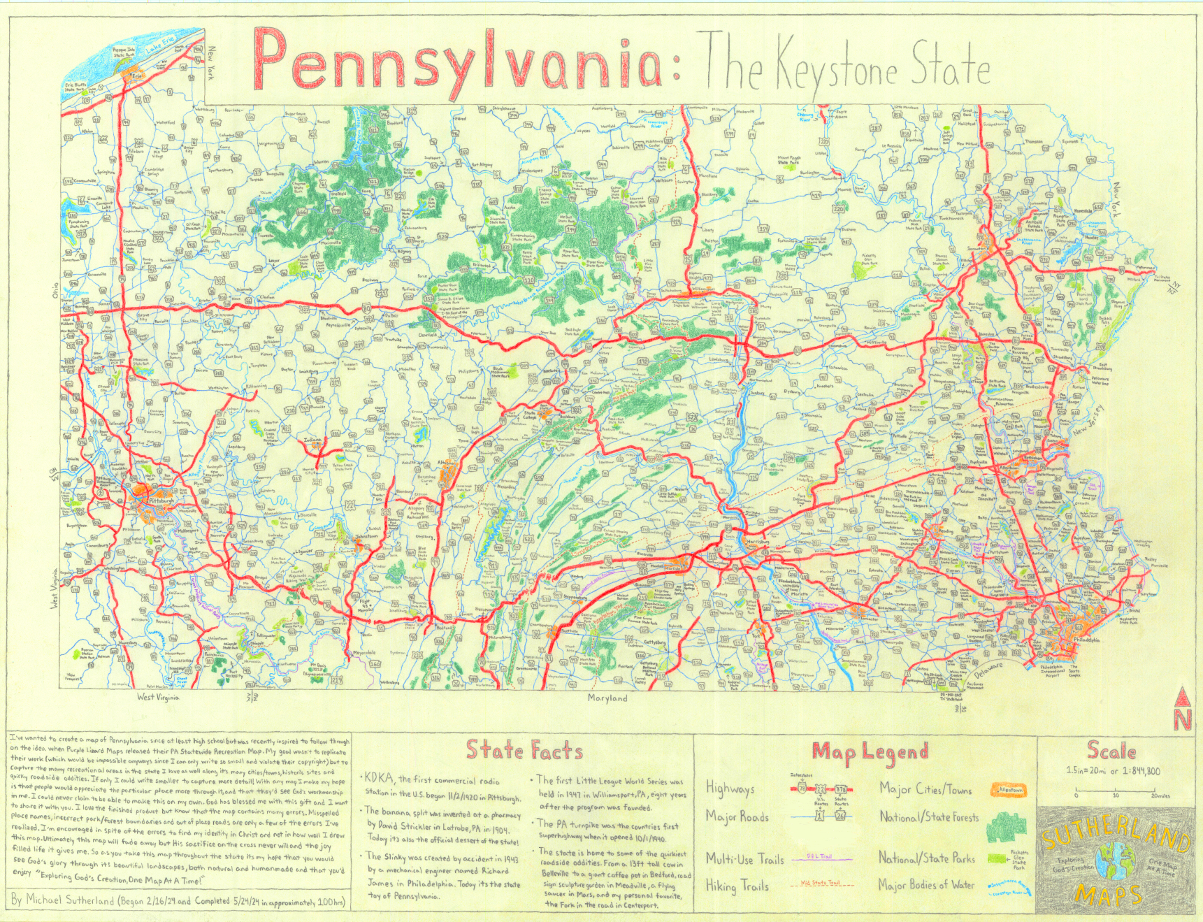 Many maps of Pennsylvania exist but how many are hand drawn? This map is unique gift for anyone who loves the state of PA! Highlighted are the maps cities, towns, roads, trails, rivers and much more. It’s not only a piece of art but accurate for navigation as well. At an 18 by 24 in size it can also be easily framed.