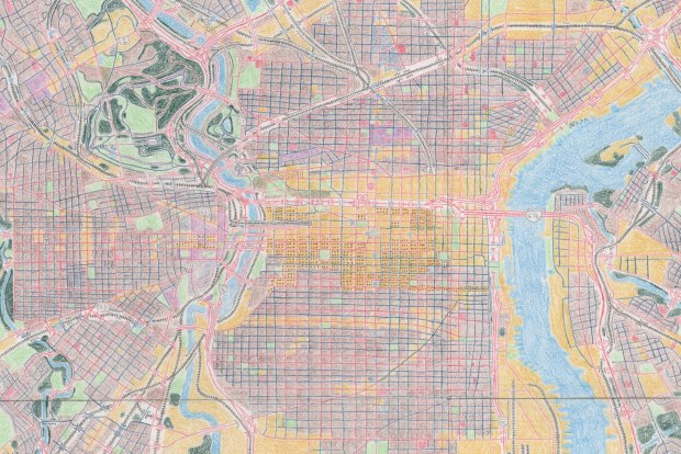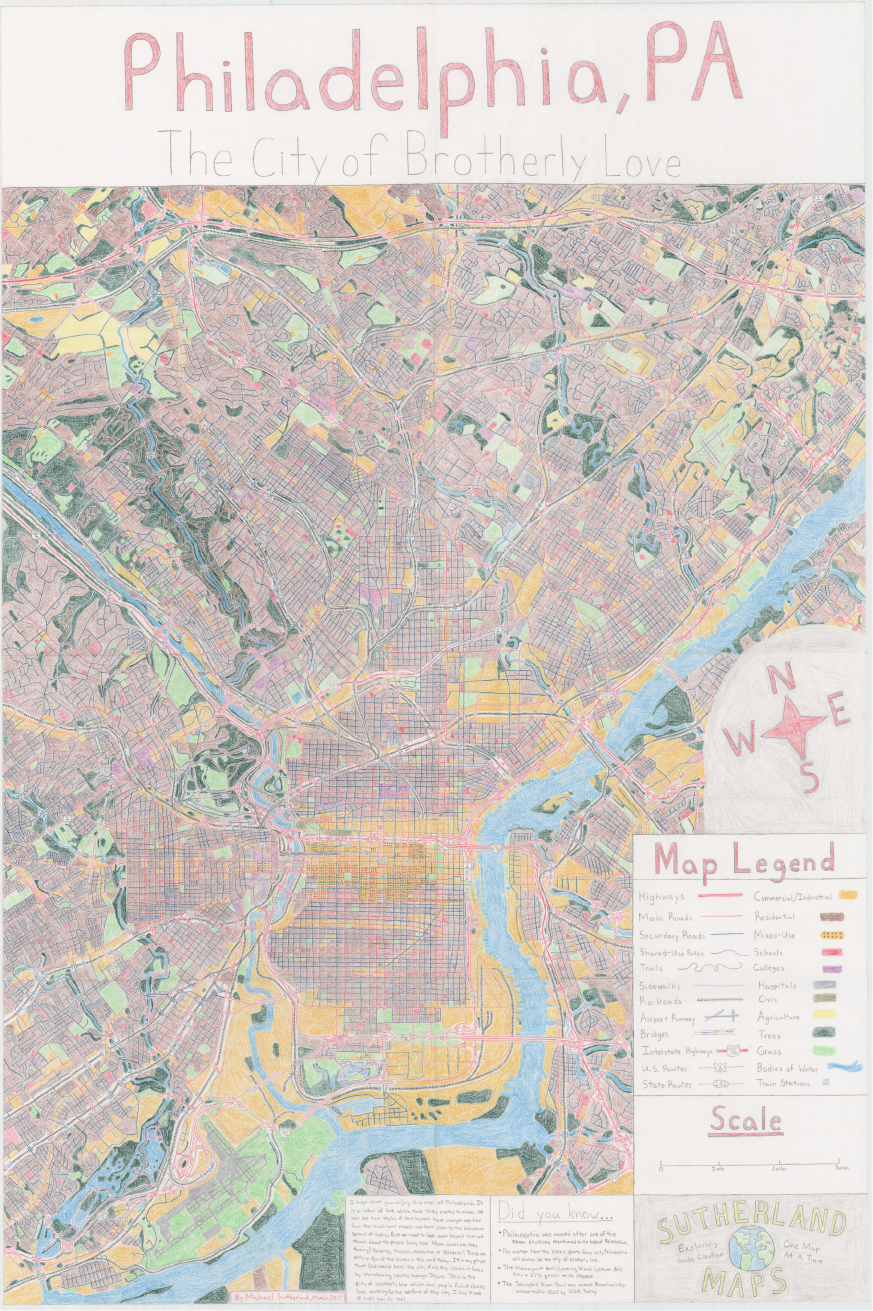 This map of Philadelphia, PA was created in 2017 as a labor of love to the beautiful city. It was drawn by hand using colored pencils over the course of three months, detailing the cities road/trails network and land-use types are displayed in great detail for the viewer to see. If you’re looking for a unique gift for a Philadelphian look no further! At a size of 24 by 36 in the map can be easily framed as well.